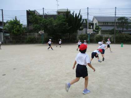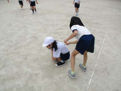 今日したのは、「ダンゴムシ鬼ごっこ」です。鬼にタッチされた人は、丸まります。そして、仲間に「ツンツン」してもらったらまた逃げられます。