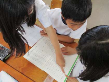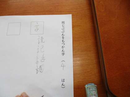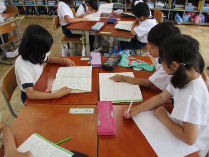 国語科では、「同じぶぶんをもつかん字」の学習をしました。みんなで確認した後、グループで教科書を見ながら、色々な「同じぶぶんをもつかん字」を見つけました。