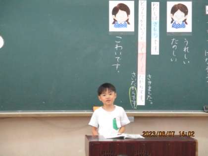 教科書のさしえを参考に,「わたしはうれしいです。」「わたしはかなしいです。」という気持ちをまず話し,そのあとにわけをつないで話しました。