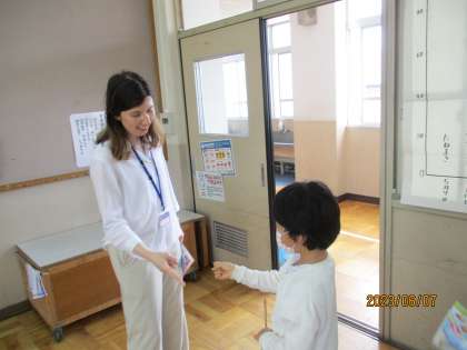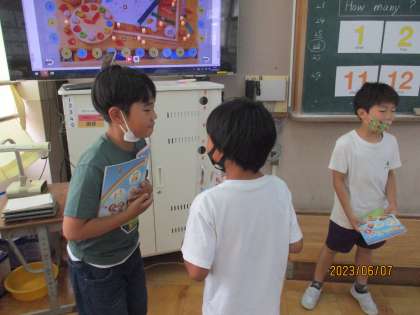外国語活動の学習で、1〜20までの英語を学習しています。何も見ずにスラスラ言える子がだんだん増えてきました。今日は、リンゴの数でHow many?クイズをしました。同じ数の友達を見つけるのはなかなか難しかったですが、楽しく活動できました。