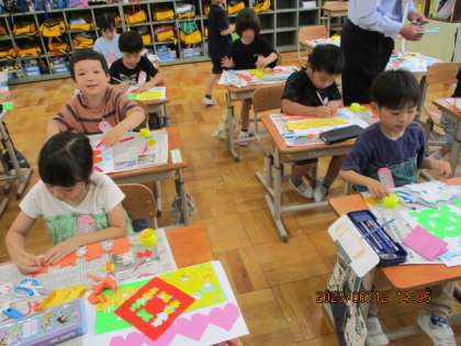 先日の参観日に見ていただいたちょきちょきかざり。今日は,仕上げをしようということで,白の画用紙に思い思いにはりつけて,さらに新しいかざりも付け足しました。