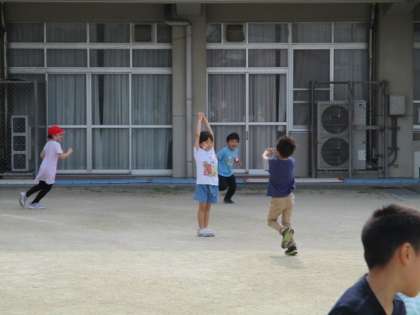 記念すべき1回目は「バナナおに」です。広い運動場を2年生と半分に区切って,思いっきり走りまわることができました。10分足らずのおにごっこでしたが,終わった後は,汗びっしょりの子ども達でした。