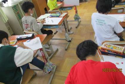 図画工作で「6月のわたしの絵」を絵の具で描きました。実際に運動場に出て、6月の花や虫、実や天気など、いろいろな気づきを一枚の絵にしました。そこへ、クレパスで描いた自分を貼って、絵を完成させました。肘や膝の曲げる部分に気を付けて、ピースをしている自分や走っている自分を描きました。