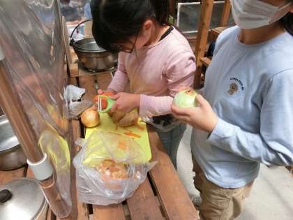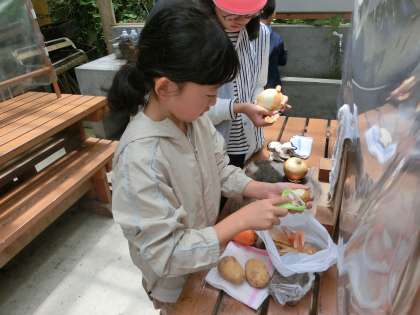 野外炊事場で、協力してカレーを作ります。