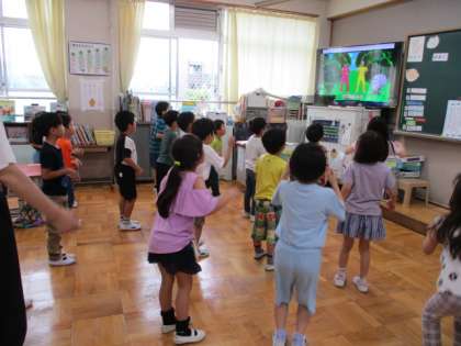 今朝は昨夜の雨のせいで運動場がゆるかったので,朝スポは教室でしました。動画を見ながらのダンスタイムです。
