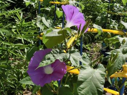 正門に並んでいる1年生の朝顔の花がいっせいに咲き始めました。
