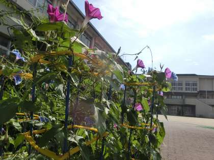 1年生の朝顔、2年生のプチトマト、3年生のホウセンカ。