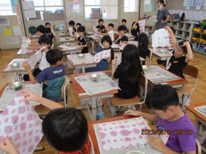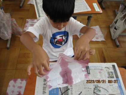 それを使って,まずは色染めを2枚しました。おり方や,色水のつけ方で十人十色の作品ができていました。お互いに見合いながら,「きれいなあ。」「おもしろいなあ。」と感想も伝え合っていた子ども達でした。
