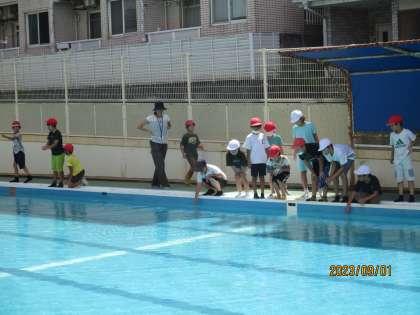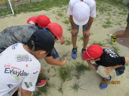 理科の学習で、運動場やプールにいる生き物を探し、どんなところにいるか、何をしているか、観察しました。プールにはアメンボ、運動場にはバッタやアリ、テントウムシなど、いろいろな生き物がいました。「葉にのぼっているアリは何をしているんだろう?」とじっと見つめていました。