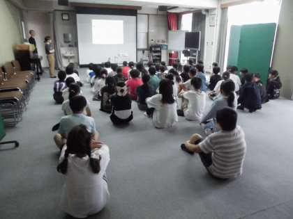 テーマの発表やどのような演技を目指していくのか等の話を聞いたり、過去の写真から先輩たちの演技に対する姿勢を見とったりして、フラッグ体操に向けて気持ちを高めている様子でした。