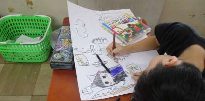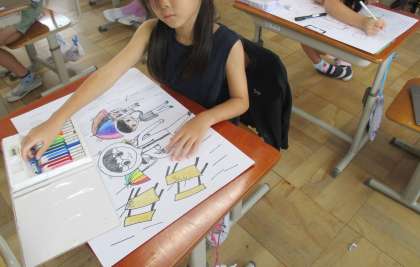 どちらもいいお話で、子どもたちはどちらにするか迷ったようです。アイデアスケッチを描く時は、「去年は登場人物が動物だったから描きやすかったけど、今年は人やからどうやって描いたらいいか分からない・・・」とみんな悩んでいましたが、タブレットで人間のイラストを参考にしながら下絵を描き、今は色を塗っているところです。
