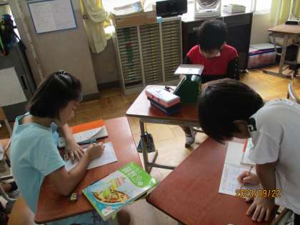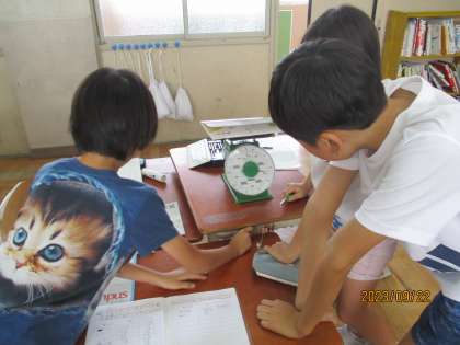 算数「重さ」の学習で、はかりを使いました。平らなところで使うこと、重すぎるものははからないことを確認し、グループで教科書やノート、筆箱などの重さを調べました。ただはかるだけでなく、重さを予想してからはかりました。