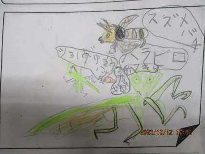 その中で「ショリョウバッタが,ちがうほうをむいていたから,あみでひっかけられたからつかまえられて,うれしかった。」という文が書かれていました。