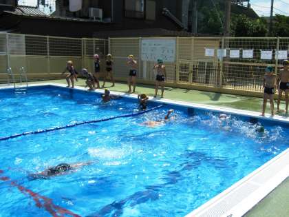 4日(火)の水泳学習は検定をしました。6月から始めた水泳学習のまとめとして今日は今までのがんばりを発揮する場として、検定を行いました。午前は高学年40名の子どもたちが、午後はろ組・低学年54名の子どもたちが自分の目標を目指して、がんばっていました。周りのお友だちに「がんばれ」「今何メートルだよ」「あと少しで25メートルだよ」という声援を受けながら力いっぱい泳ぎました。明日5日は最後の水泳学習です。がんばって泳ぎに来てください。