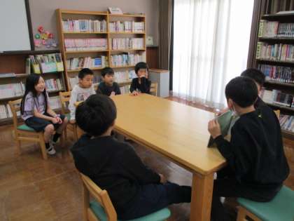 今日は,3年生が国語の学習の取り組みとして,1年生への読み聞かせの時間を作ってくれました。号車ごとに6つの机に分かれ,3年生の6つのグループが順番にそれぞれの机をまわってくれました。