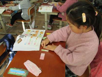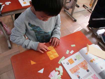 今日の算数は、もようづくりをしました。長方形、正方形、直角三角形の形をしたカードを並べて、色々なもようをつくります。