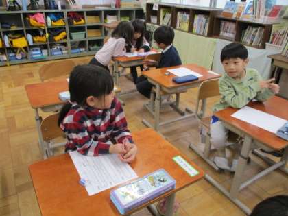 昨日はまず二人組になって,お互いにインタビューをしあいました。スタートの質問は全員が「いま,一ばんすきなことは なんですか。」から始まりますが,そのあとの質問は相手が答えてくれたことに合わせて,自分で考えながらすすめていくことになるので,一人一人がんばって質問をしました,