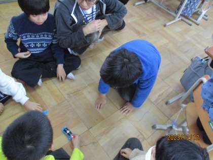「みんなの導線をつなげたらどうなるのかな?」という疑問から、号車ごとにつなげたり、クラス全員の導線をつなげたりして、回路を作ることになりました。「3・2・1!」とみんなで声をかけ、スイッチを押すと…豆電球が光りました!