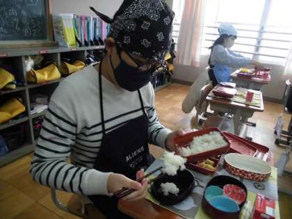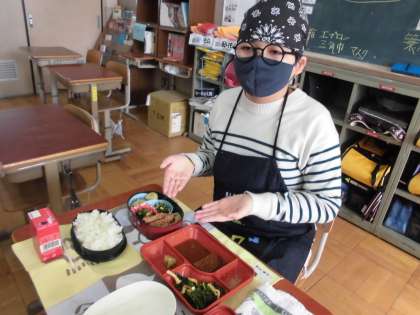その後、中学校の給食を持参したお弁当箱に移し替え、自分のお弁当箱にはどのくらいの量が入り、どのくらいのエネルギーを摂取できるのかを実際に確認!