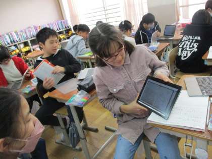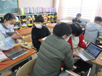 図書室にある詩集の中から、自分の気に入った詩を選び、友達におすすめしました。なぜその詩を選んだのか、自分はどういう解釈をしたのかをタブレットを使って伝えました。いろいろな解釈があっておもしろかったです。