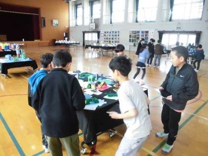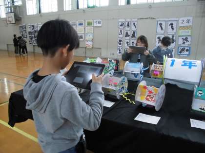 今日は、作品展の鑑賞をしました。それぞれの学年の作品をじっくり見て友達と感想を言い合っていました。