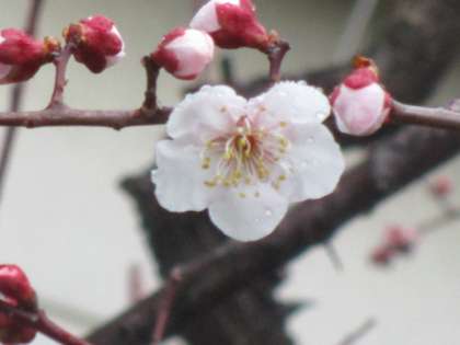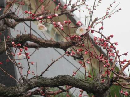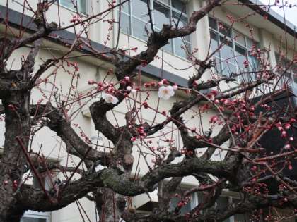 学校の梅の木に、可愛らしい花が咲き始めました。