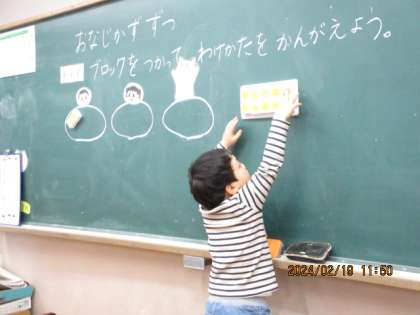 今日の算数は2,3年生で学習する「かけざん・わりざん」のもとの考え方につながる「同じ数ずつ」についてでした。