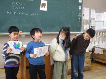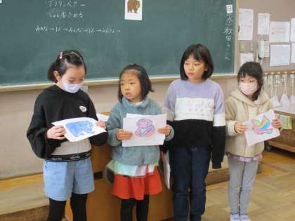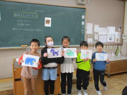 今日は、最後の英語活動の授業で、グループオリジナルの絵本を紹介しました。