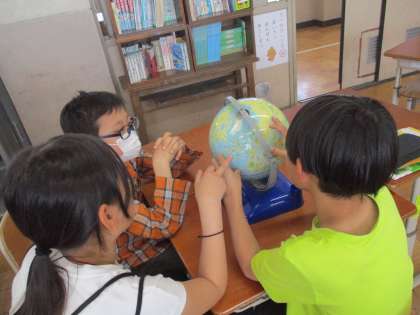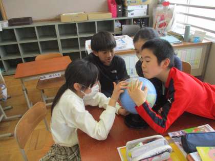 社会「世界の中の国土」の学習で、世界の国々と日本の国土について学びました。地球儀を使って国の位置を確認したり、赤道や経線・緯線を確認したりしました。世界の国について興味を持っている子が多く、楽しんで活動しました。