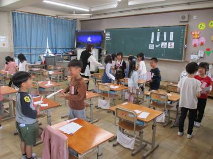 1年生は、自分の名前を丁寧に書いた名刺カードを作り、それを持ってお友達と自己紹介をし合いました。