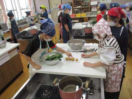 家庭科「ゆでる調理でおいしさ発見」の学習で、実際にゆでいもとほうれん草のおひたしを作りました。グループで協力して、作り方を確認しながら、時間内に作り上げることができました。「しょうゆをかけすぎた」という声もありましたが、自分たちで作ったゆでいもとほうれん草のおひたしに大満足のようでした。