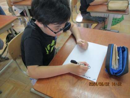 「自分の指」を素材にして,「ゆっくり」「じっくり」「そっくり」を意識して描くよと伝えました。サインペンで描くよと言うと「えー!!」と驚きの声が上がっていましたが,いざ描き始めると,しーんとした教室の中で,真剣な表情で取り組んでいた子ども達でした。