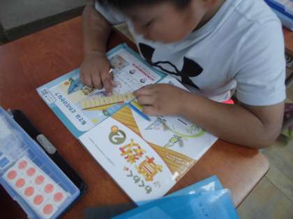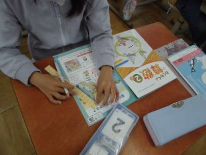今日は、教科書の問いから、「みんな共通の同じものを使って比べないといけない。」ということを確認しました。その後、教科書に付いている紙のものさしを使って目盛りいくつ分かで長さを比べました。