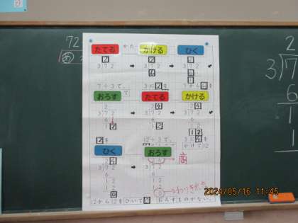 昨日から,算数の新しい単元「1けたでわるわり算の筆算」に入っています。今日はいよいよ筆算のやり方をみんなで確かめました。
