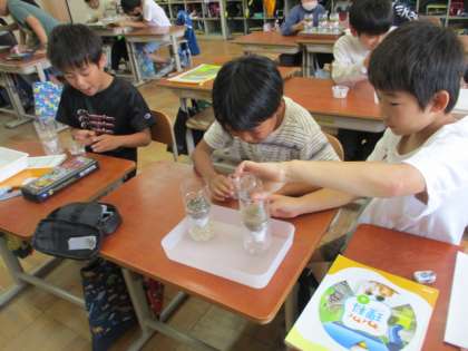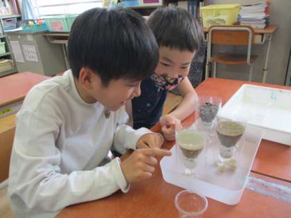 「よーいどん」で水を注いで,そのあとの変化を確かめましたが,見事にしみこむ速さも下にたまっていく水の色も違いがあって,見守る子ども達も目を輝かせていました。