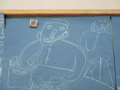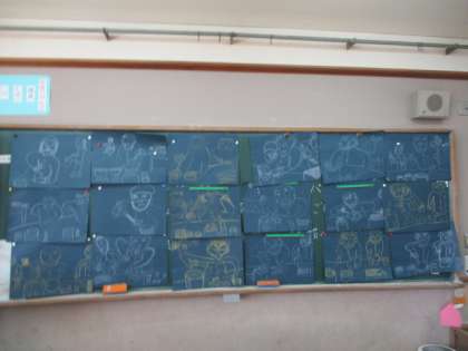 図工は,「給食当番の絵」の線描を進めてきました。まず自分を描き,その周りに友達を1〜2名描き,そして給食台の様子を描いて,コンテでの線描は完成です。おかずをよそう人,ごはんをよそう人,牛乳を運ぶ人など楽しい給食当番の様子が描かれてきました。