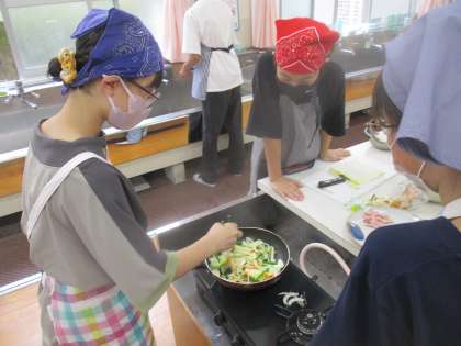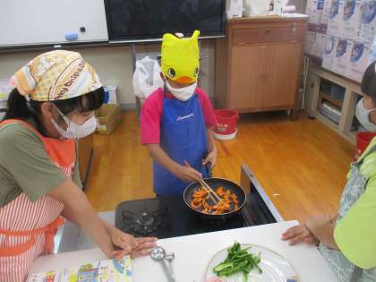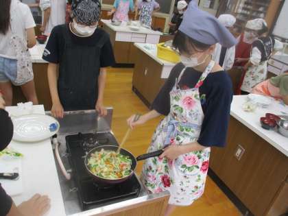 今日は家庭科で調理実習をしました。野菜をいためて「いろどりいため」を作りました。火加減に気をつけてシャキシャキとした食感が残るように調理しました。