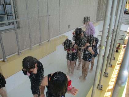 他の学年の子たちが名付けた「地獄のシャワー」の時間は、気温とシャワーの水温の差があるため、暑い暑いと言っていた子どもたちも「キャー!」と叫んでいました。