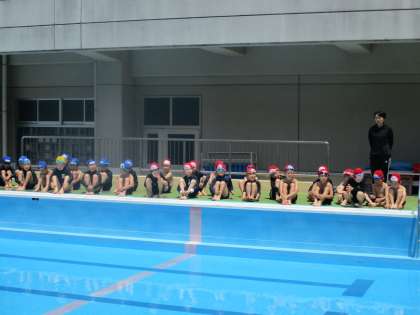 1年生は、小学校での初めての水遊びです。大きなプールに興奮しているみんな。水遊びは楽しくもあるけれども、ふざけたり、お喋りをして先生の言っている事を聞かなかったりすると、とても危険で命に関わるということも、みんなで確認しました。