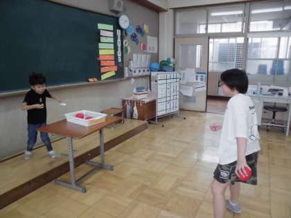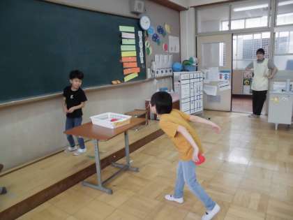 おにが、後ろを向いて「だるまさんがひろった」と言っている間に、プレーヤーが前に進むのは同じですが、プレーヤーが玉入れの玉を持っていて、おにに見つからないように、おにの前にあるかごに玉を入れたたら1点というルールなのです。