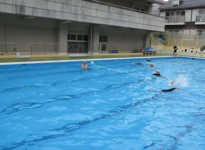 待ちに待った水泳学習が始まりました。曇り空だったので、少し肌寒かったようでした。水中じゃんけんをしたり、だるま浮きをしたりして、水慣れをした後、蹴伸びやクロールに挑戦しました。友達同士教え合う姿がたくさんありました。