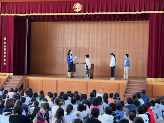 今日は、1時間目に体育館で朝会・児童集会が行われました。