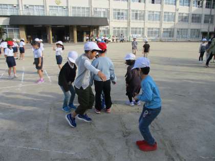今週の朝スポは、9マス鬼ごっこに挑戦しました。1チーム6人ほどで挑戦します。土の上に9マスのマス目をかき、鬼になった人は真ん中のマス目に、その他の人は好きなマス目からスタートします。鬼の「いっせーのーで!」の掛け声で、ジャンプをしてマス目を一つ移動します。鬼と同じマス目に移動してしまった人はアウトになり、全員がアウトになるまで続けるという鬼ごっこです。