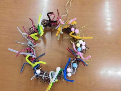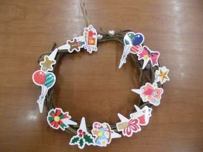 1年生はあさがおの,2年生・3年生・5年生はサツマイモの蔓で作ったリース台に飾りつけをしました。
