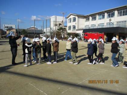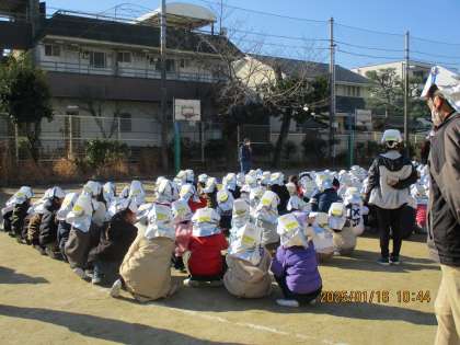 子どもたちは地震発生の合図とともに素早く机の下に身を隠し、火災の発生を知らせると、先生と共に緊張した面持ちで運動場に避難していました。