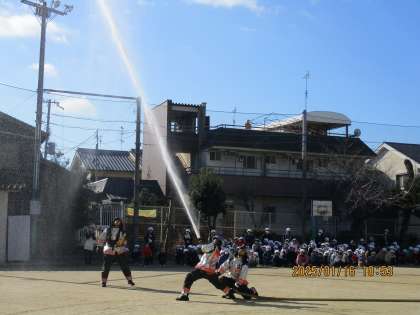 放水訓練の様子も見せていただきました。消防隊員の方の緊張感のあるきびきびとした活動の様子に、子どもたちは日頃からの訓練の大切さも感じているようでした。