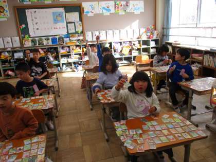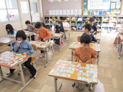 先週、1年生は伏見〜るかるたに挑戦しました。初めての人が多かったので、一人ずつ取り札を机に置き、じっくりと取り組めるよう、18組の取り札を用意して挑戦しました。