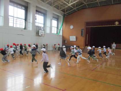 朝スポーツでは体育の授業でも行ったことのある「ねことねずみ」をしました。子ども達はすでに経験のある遊びということもあり、元気いっぱいに楽しんで活動していました。