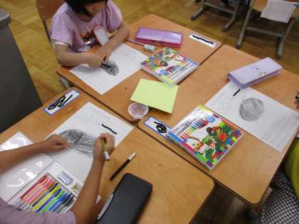 色や大きさ、形、手ざわりなどをポイントに、観察しました。「黒っぽいけど、黒だけじゃなくて茶色も混じっている所がある」「すいかを切った形に似てる」「つるつるしてる」など、子どもたちの中からたくさんの意見が出て、それを絵に表して行きました。