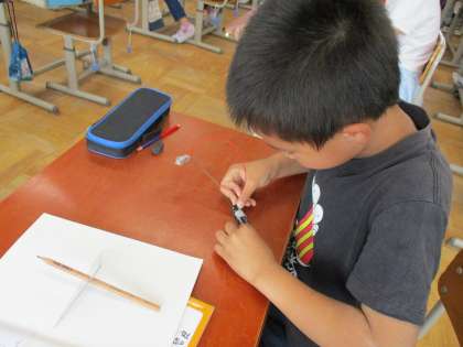 今日は、3年生のときの学習を生かして、豆電球に明かりをつけてみました。